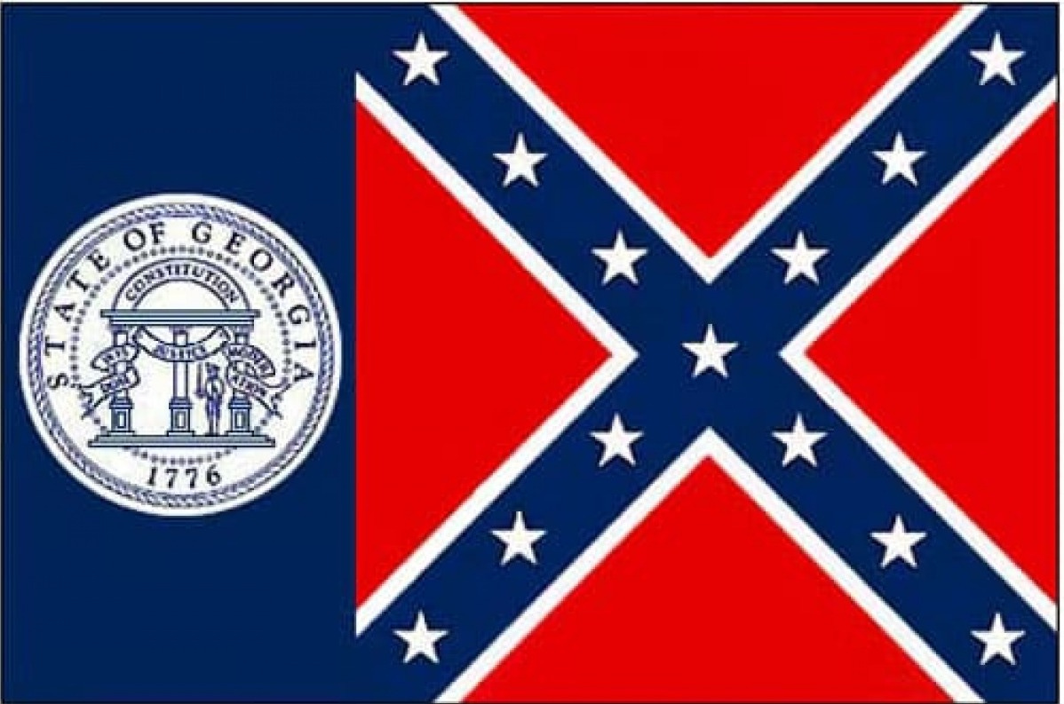The backstory is such: Georgia’d had some guy redesign its state flag in 2001, mostly as a way to deal with the Confederate battle flag they’d stuck on there after Brown v Board of Education in the 50s. This was as tendentious as you’d imagine—many people loved that anti-desegregation flag, said it evoked “heritage” (typically without a specifier like “Southern” or “Our”—just “Heritage,” heritage as an end to itself). The new one was a blue flag with the state seal in the middle and an orange ribbon beneath it with five more little flags in a row and the words “Georgia’s History.” Two of them were just the Stars and Stripes for some reason, then the three previous state flags of Georgia, out of order, and of course including the one with the Confederate battle flag on it.